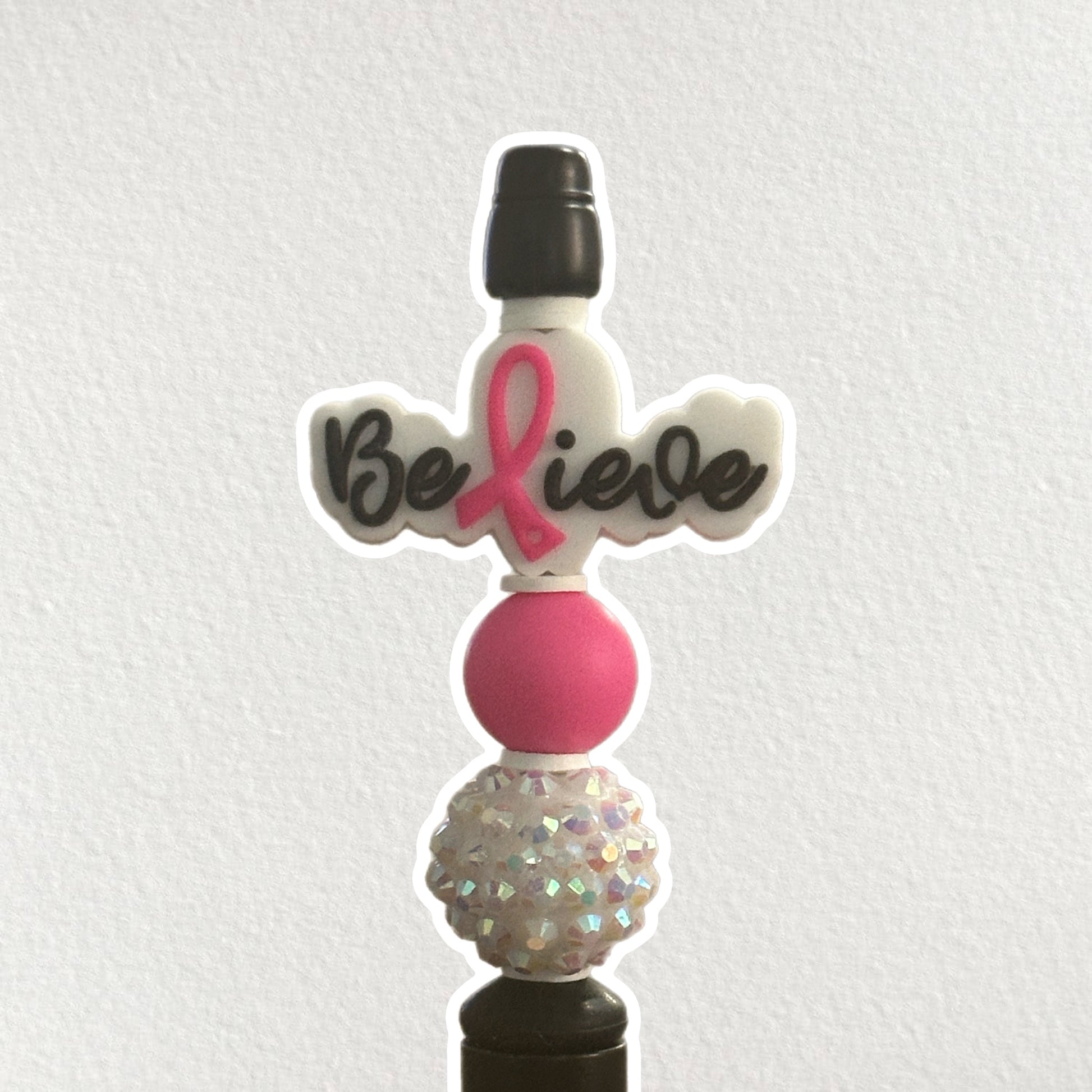 Unleash your imagination with the Believe Ballpoint Pen! Show your support for breast cancer awareness with the recognizable pink ribbon design on this classic and easy-to-use pen. Making sure your thoughts never run dry! Don't miss out on this pen that will always deliver! Believe it!