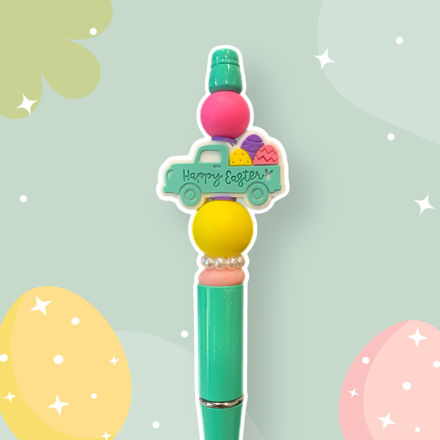 Hop on board the Hauling Easter Express (get it?)! This quirky pen features a teal truck with Easter eggs in the back, perfect for writing notes or doodling. Be the envy of all your friends with this one-of-a-kind pen.